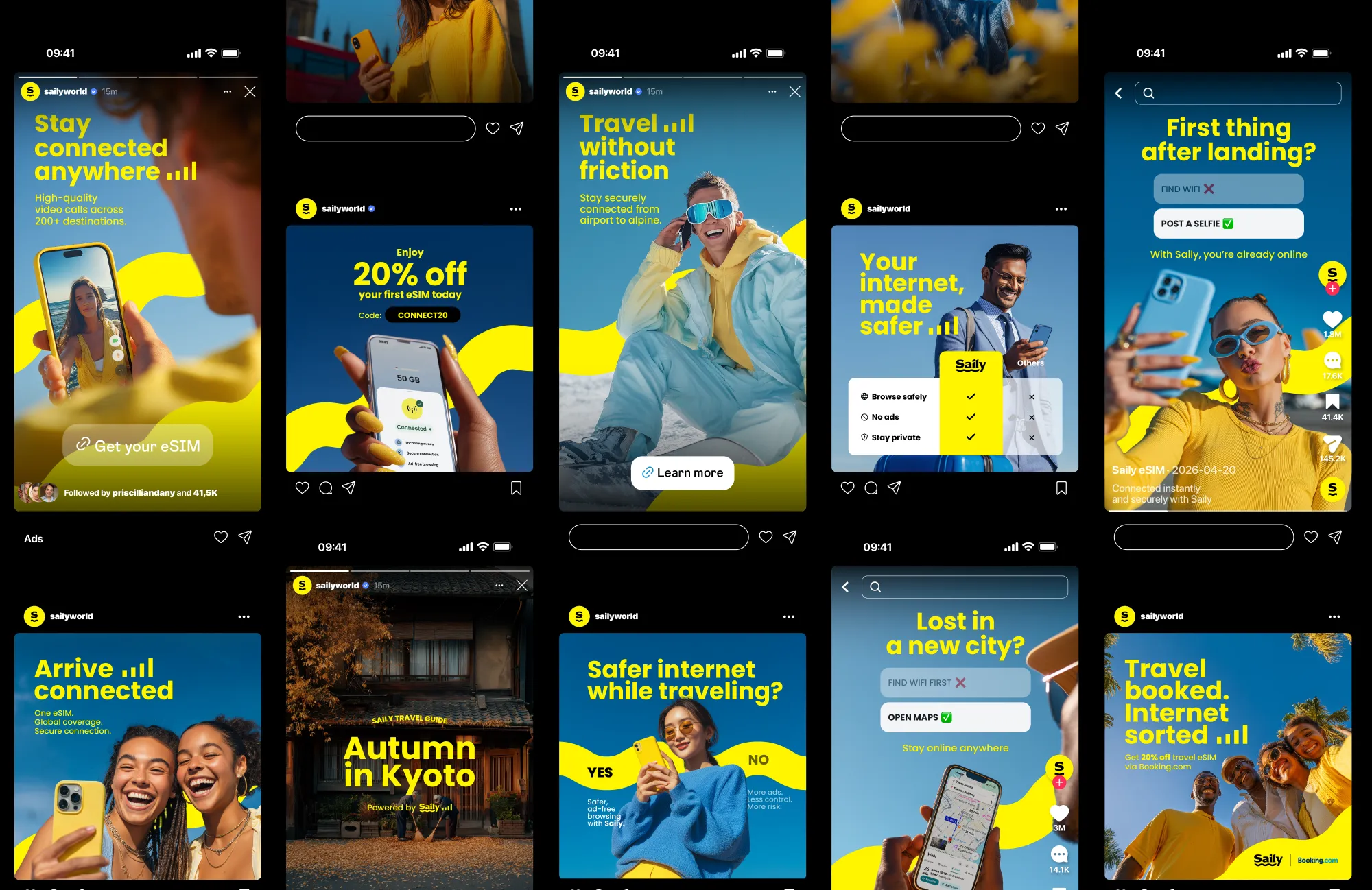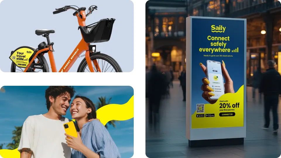 International travel often begins with connectivity friction, as travelers search for Wi-Fi, buy local SIM cards, or navigate roaming limitations. Saily is a global eSIM service that enables instant connection without physical SIM cards, and uniquely offers built-in network-level-security, including virtual location, web protection, and ad blocking. This self-initiated project explores how Saily's existing brand assets could be applied more effectively across marketing channels to improve clarity, strengthen benefit-led communication, and create a scalable campaign system within its current visual identity.