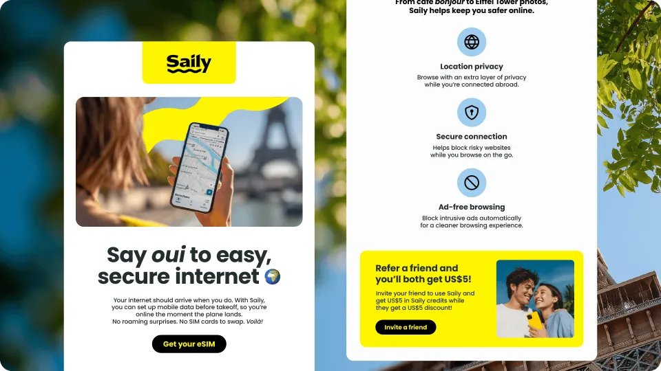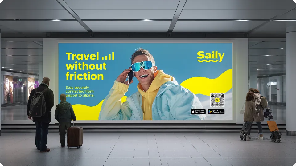 International travel often begins with connectivity friction, as travelers search for Wi-Fi, buy local SIM cards, or navigate roaming limitations. Saily is a global eSIM service that enables instant connection without physical SIM cards, and uniquely offers built-in network-level-security, including virtual location, web protection, and ad blocking. This self-initiated project explores how Saily's existing brand assets could be applied more effectively across marketing channels to improve clarity, strengthen benefit-led communication, and create a scalable campaign system within its current visual identity.